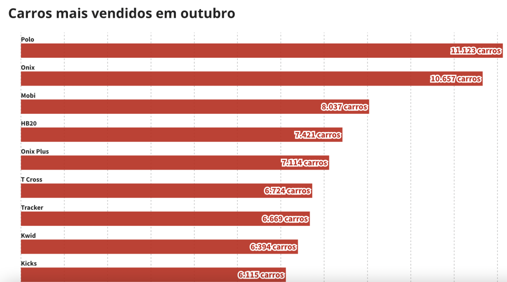Fonte: FenabraveNo acumulado do ano até outubro, Polo, Onix e HB20 foram os três veículos mais vendidos no país, com mais de 233 mil unidades comercializadas no total.